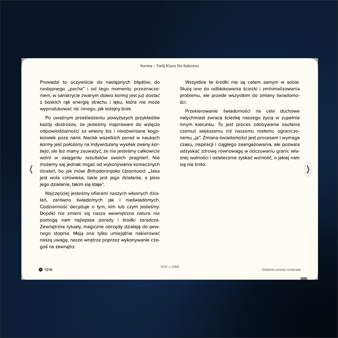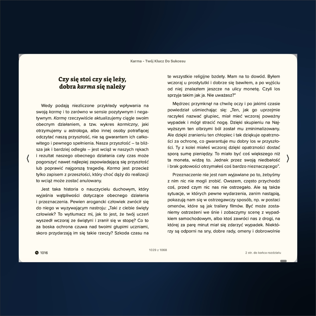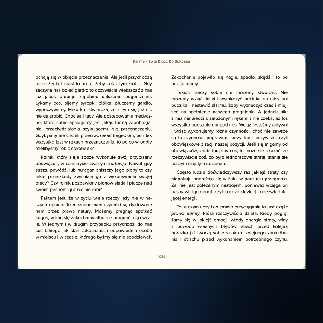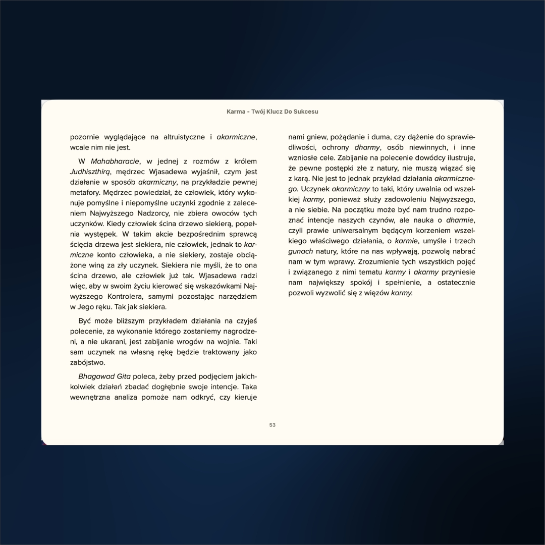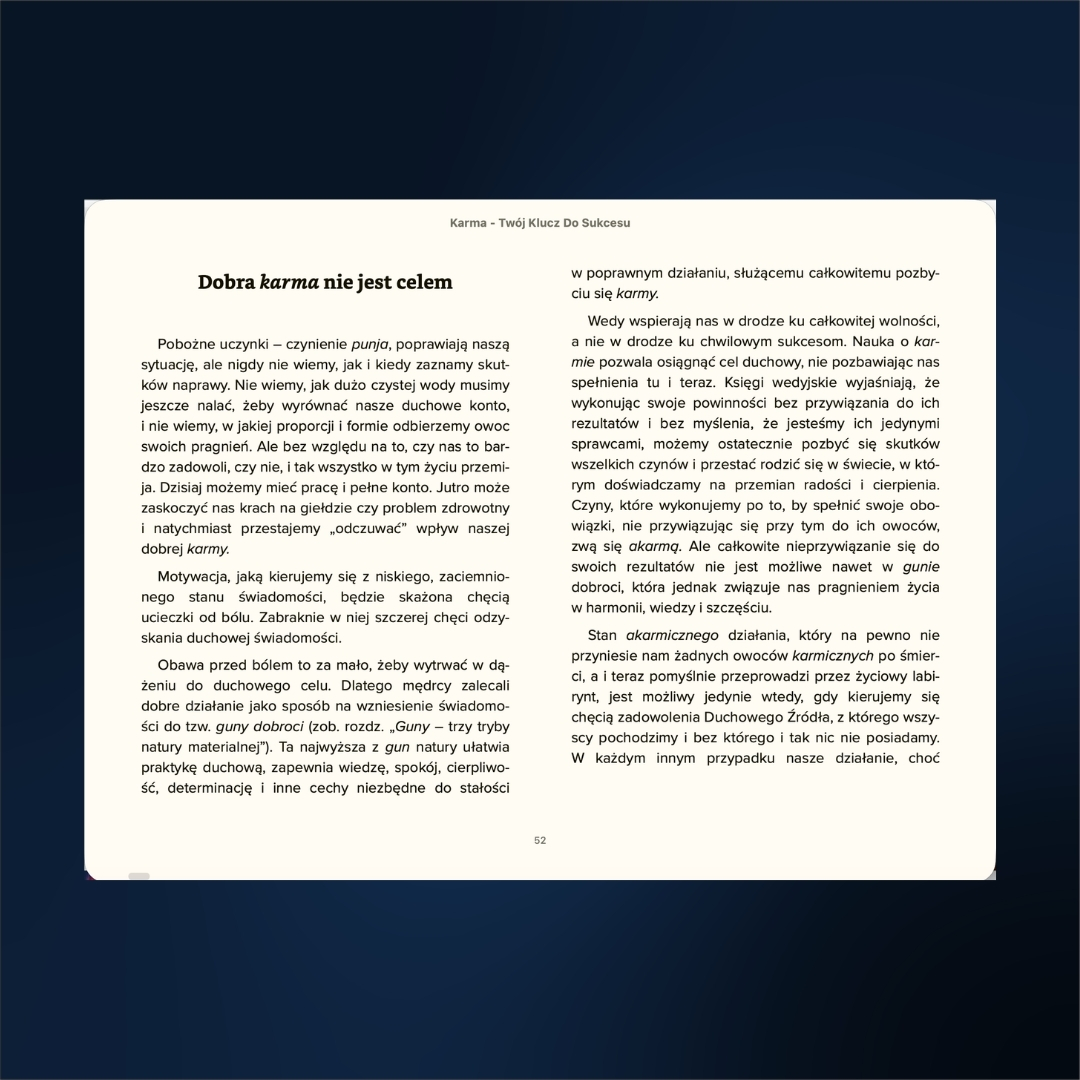 Odpowiedzi, których szukasz, nie powstały wczoraj. Są zawarte w Wedach – wiedzy spisanej ponad 5000 lat temu, która stanowi kompletną instrukcję obsługi ludzkiego życia. Książka „Karma – Twój klucz do Sukcesu” Idy Smeli to nie kolejny powierzchowny poradnik motywacyjny. To potężne kompendium wiedzy, ponad 600 stron A 4, które zabierze Cię w podróż do źródeł wedyjskiej ontologii, wyjaśniając mechanizmy rządzące Twoim losem, zdrowiem i umysłem.