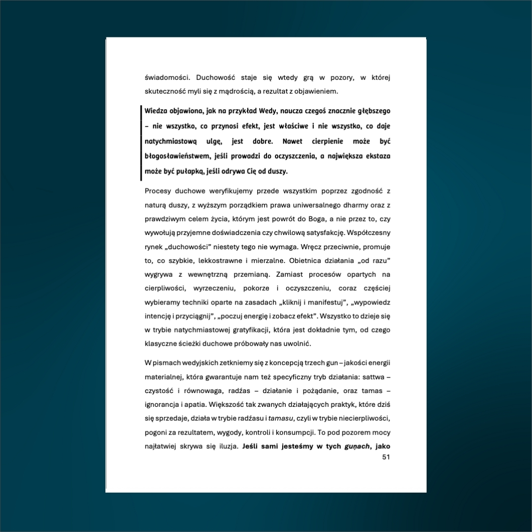 Umysł pragnie tworzyć, energia pragnie istnieć, a jaźń pragnie relacji – głębokiej więzi z Najwyższą Prawdą. Dotąd przypisywaliśmy tym poziomom niewłaściwe znaczenie, myląc moc kreacji z sensem istnienia. Gdy przetasujemy ich hierarchię, sens wszystkiego ulega zmianie. Życie nie polega już na kontroli czy na nieustannej kreacji. Kiedy odkrywamy nowy wymiar, w którym najważniejsza jest relacja z Najwyższą Prawdą, czyli coś trwałego i ponadczasowego, wszystko, co wcześniej wydawało się oczywiste, ukazuje się w zupełnie innym świetle.